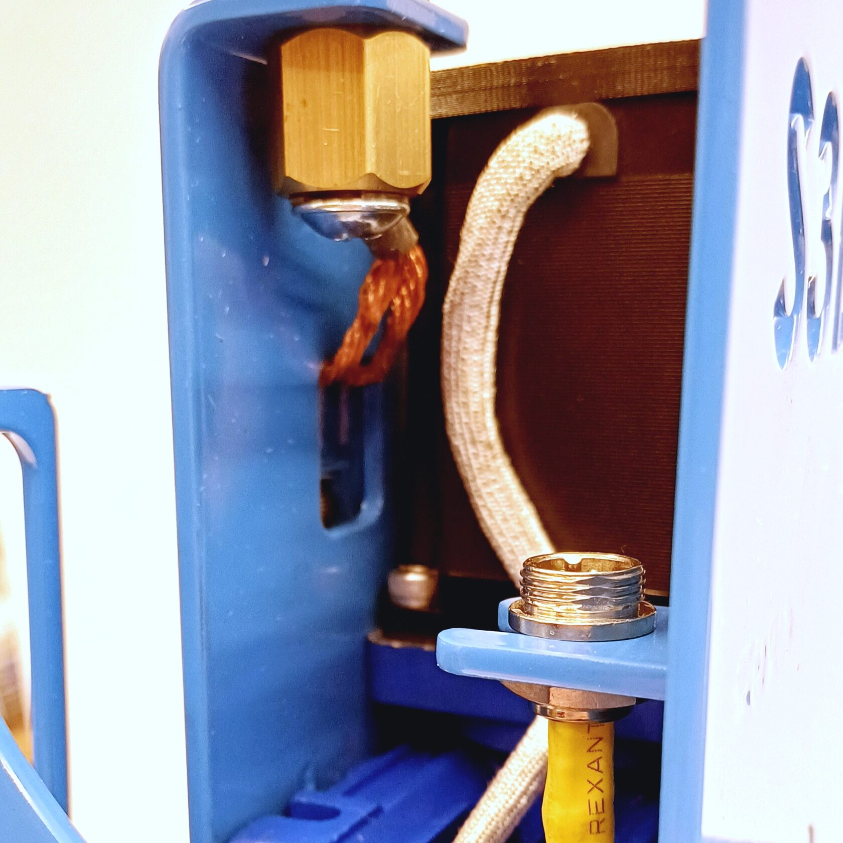 Токоприёмник выполнен в виде розетки для стандартных сварочных разъёмов. К нему можно подключиться как сварочными клещами, так и изготовить дополнительно кабель для надёжного подключения к сварочному аппарату (кабель не входит в стандартную комплектацию).